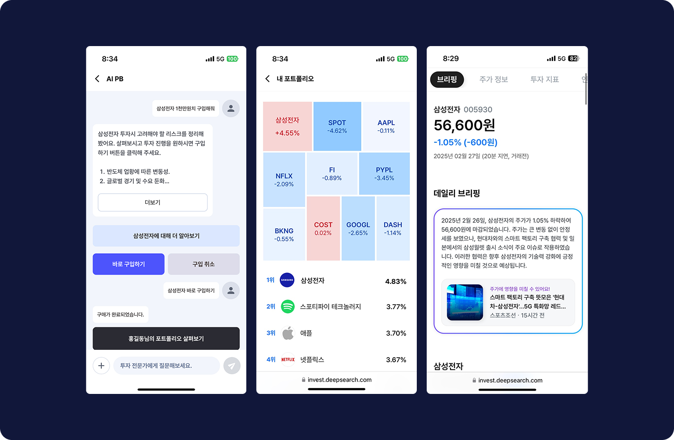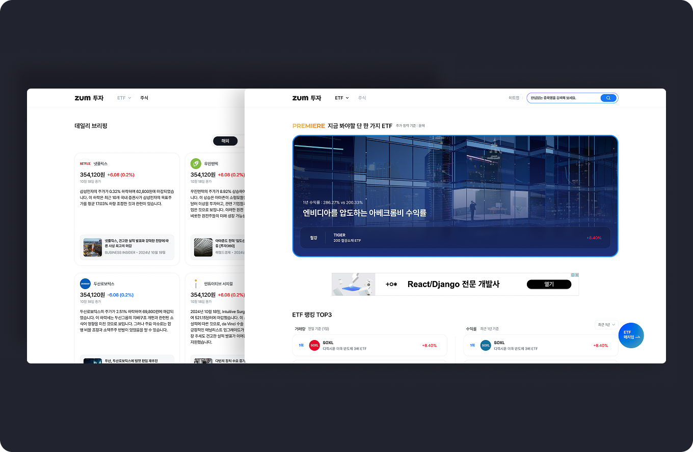Supports the construction of various services such as investment information, analysis, and recommendations on app/web platforms. (e.g., K-Bank, Zuminternet)